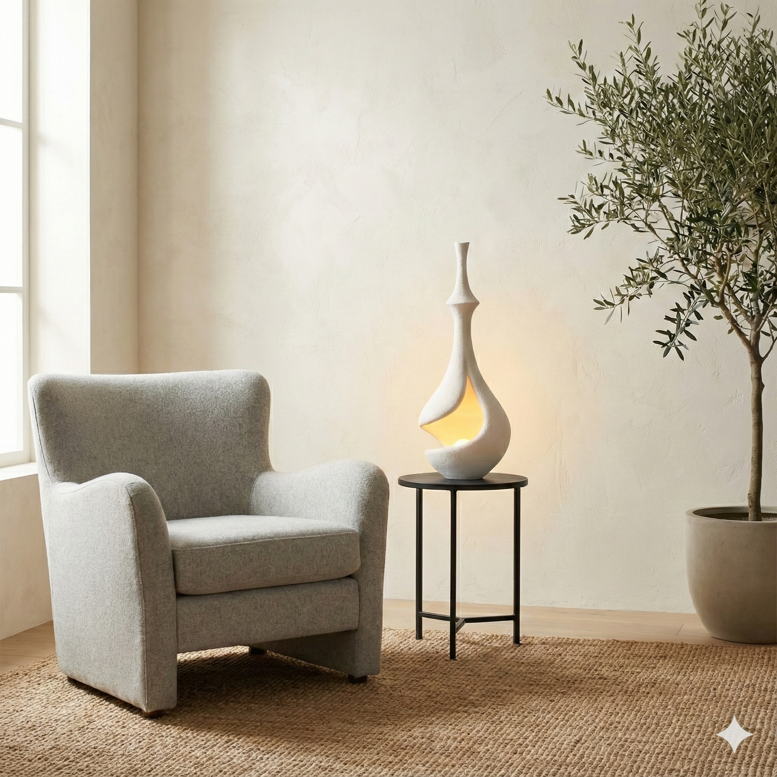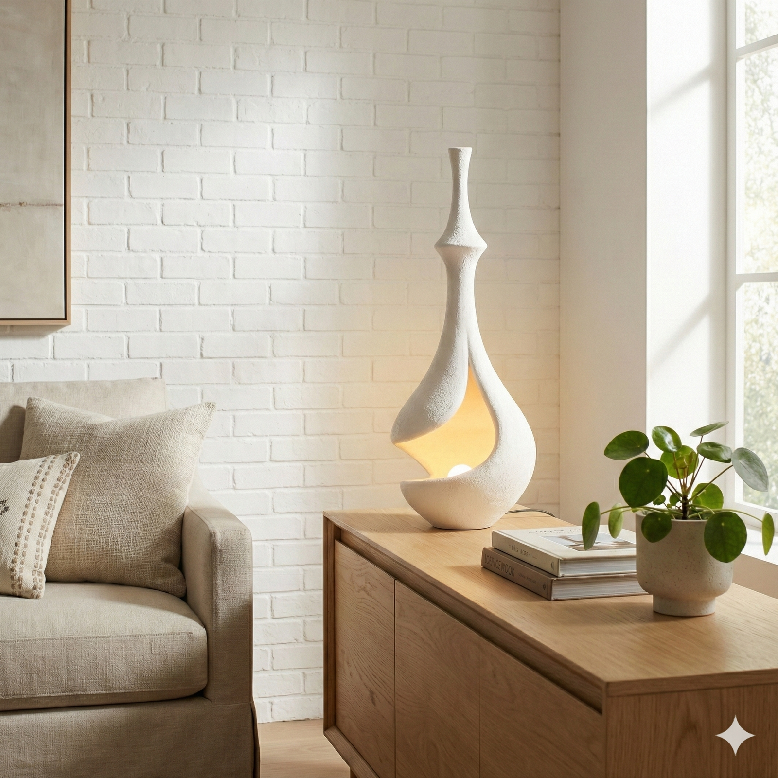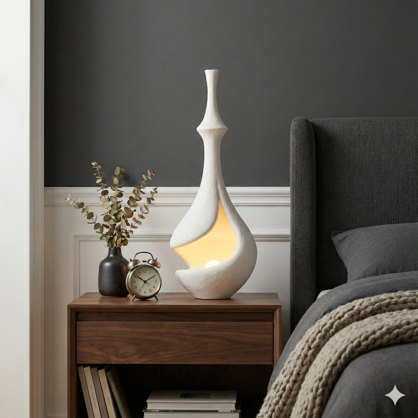 L’élégance organique à l’état pur. Avec sa silhouette élancée et sa finition texturée blanc mat aspect plâtre, cette lampe sculpturale évoque la poterie artisanale méditerranéenne. Elle diffuse une lumière chaude depuis son cœur, créant une ambiance sereine et sophistiquée.