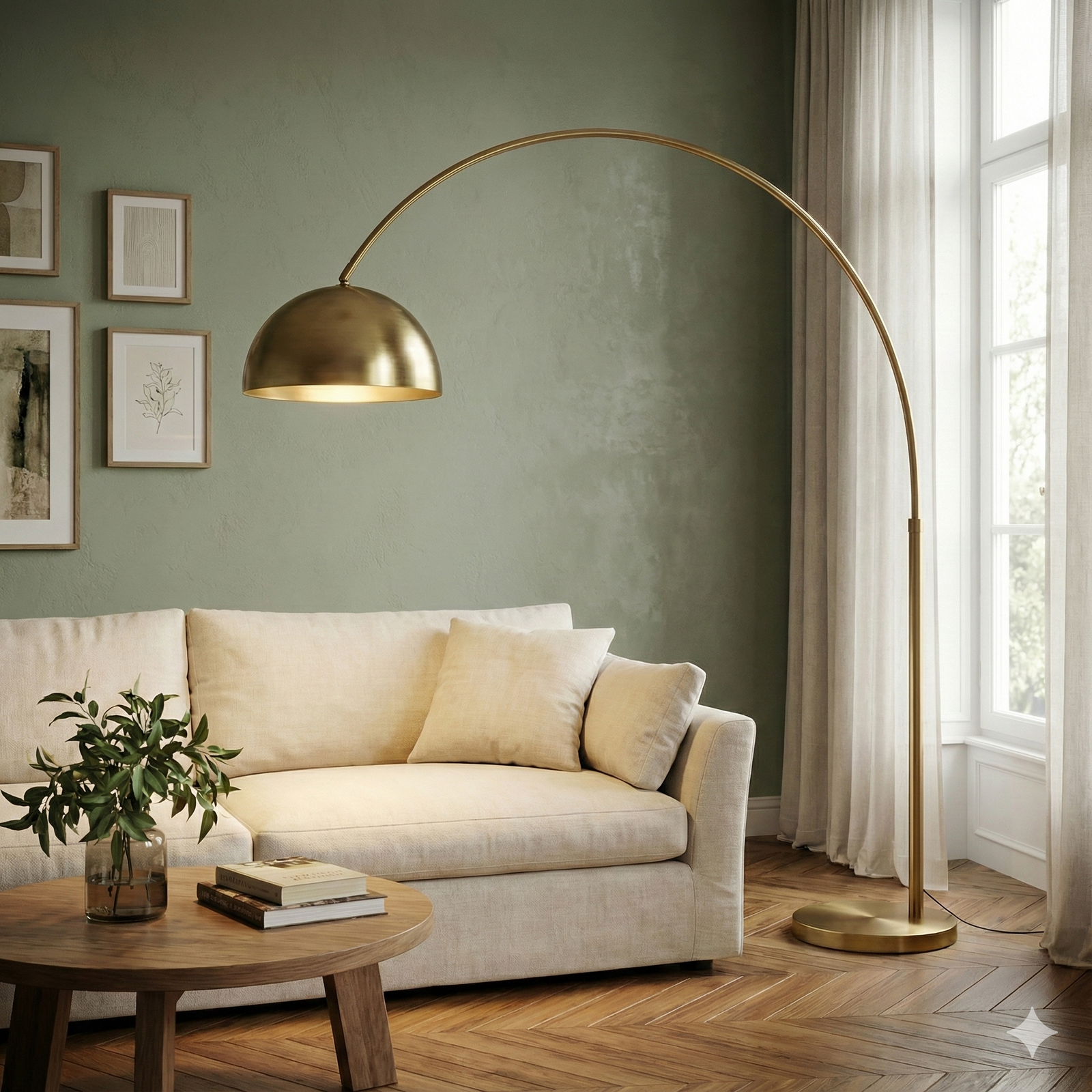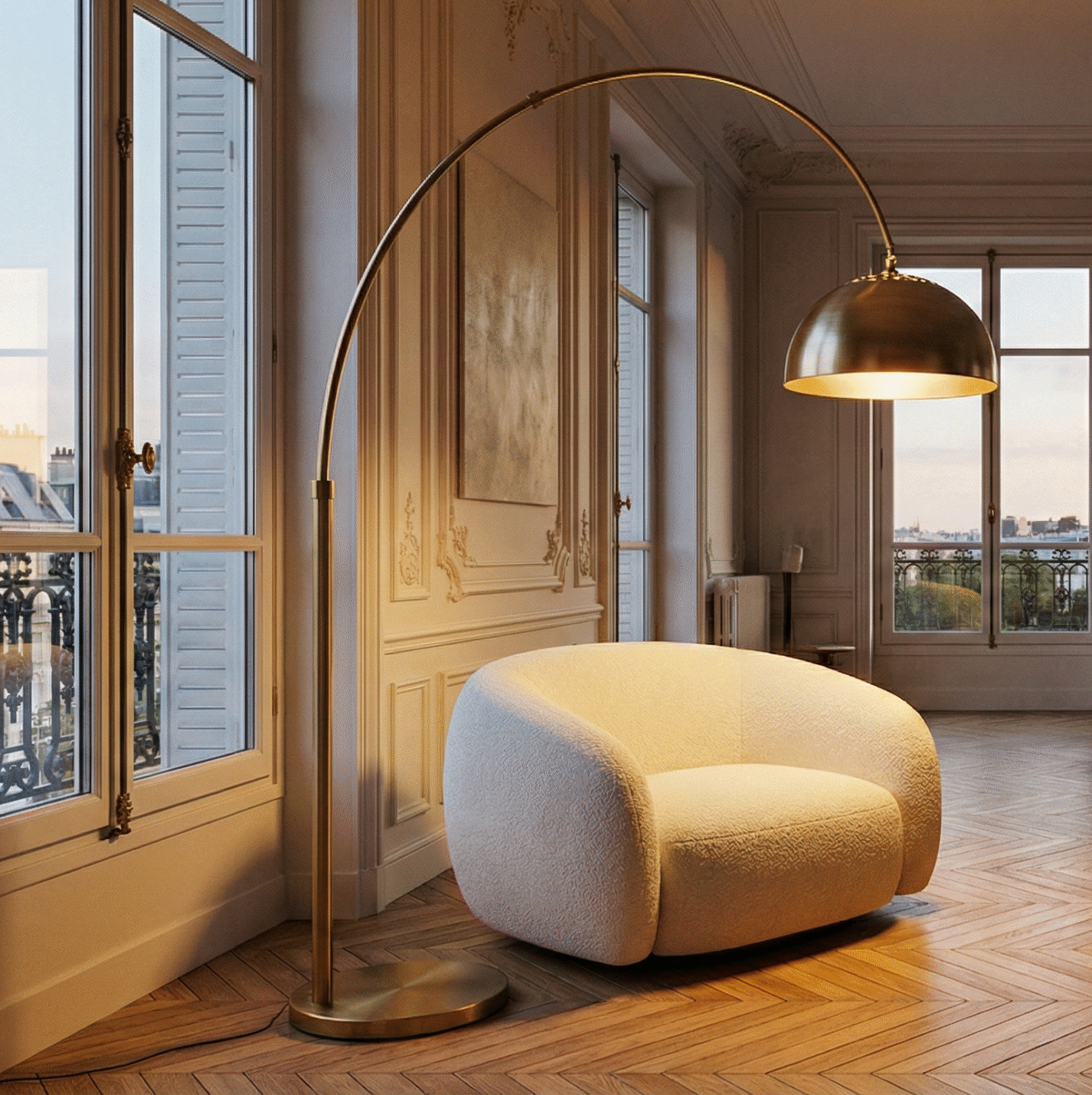 Une arche majestueuse en laiton brossé qui structure l’espace et devient le point focal de votre salon. Diffuse une lumière chaude et descendante, idéale pour créer une atmosphère intime et sophistiquée au-dessus d’un fauteuil ou d’une table basse.