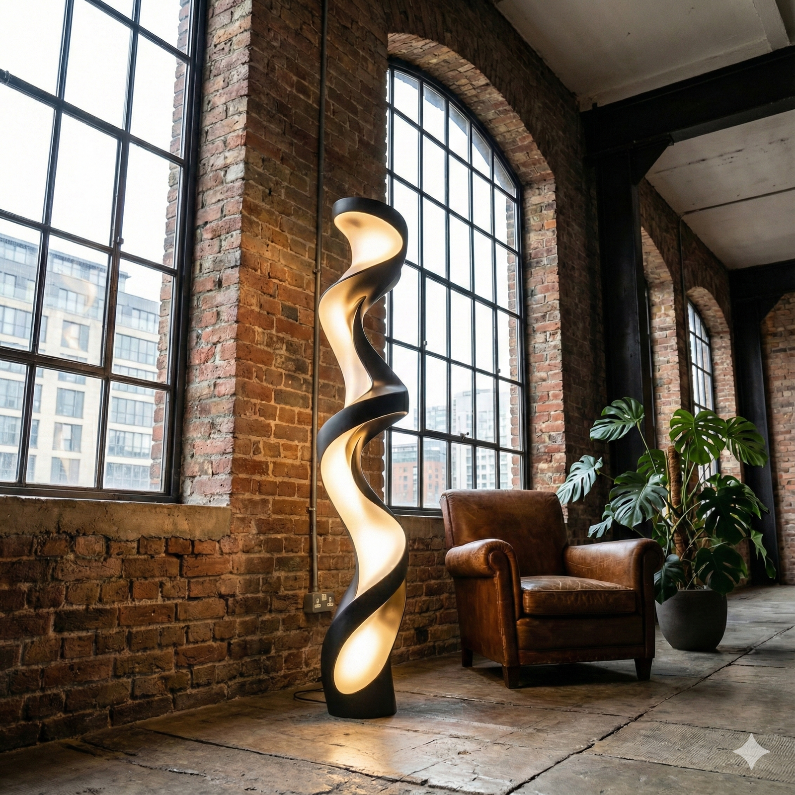 Structure : Une forme torsadée unique qui intègre la source lumineuse en son cœur.